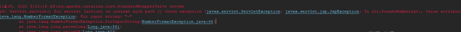 파일: 경로 []의 컨텍스트에서 서블릿 [action]에 대한 서블릿.service()가 예외 [javax.servlet]을(를) 던졌습니다.ServletException: javax.servlet.jsp.JspException: <formatNumber>에서 값 속성을 java.lang으로 구문 분석할 수 없습니다.번호: "-"] 근본 원인 포함