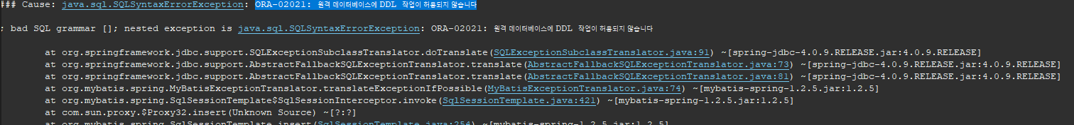 ### Cause: java.sql.SQLSyntaxErrorException: ORA-02021: 원격 데이터베이스에 DDL 작업이 허용되지 않습니다 ; bad SQL grammar []; nested exception is java.sql.SQLSyntaxErrorException: ORA-02021: 원격 데이터베이스에 DDL 작업이 허용되지 않습니다 at org.springframework.jdbc.support.SQLExceptionSubclassTranslator.doTranslate(SQLExceptionSubclassTranslator.java:91) ~[spring-jdbc-4.0.9.RELEASE.jar:4.0.9.RELEASE] at org.springframework.jdbc.support.AbstractFallbackSQLExceptionTranslator.translate(AbstractFallbackSQLExceptionTranslator.java:73) ~[spring-jdbc-4.0.9.RELEASE.jar:4.0.9.RELEASE] at org.springframework.jdbc.support.AbstractFallbackSQLExceptionTranslator.translate(AbstractFallbackSQLExceptionTranslator.java:81) ~[spring-jdbc-4.0.9.RELEASE.jar:4.0.9.RELEASE] at org.mybatis.spring.MyBatisExceptionTranslator.translateExceptionIfPossible(MyBatisExceptionTranslator.java:74) ~[mybatis-spring-1.2.5.jar:1.2.5] at org.mybatis.spring.SqlSessionTemplate$SqlSessionInterceptor.invoke(SqlSessionTemplate.java:421) ~[mybatis-spring-1.2.5.jar:1.2.5] at com.sun.proxy.$Proxy32.insert(Unknown Source) ~[?:?] at org.mybatis.spring.SqlSessionTemplate.insert(SqlSessionTemplate.java:254) ~[mybatis-spring-1.2.5.jar:1.2.5]